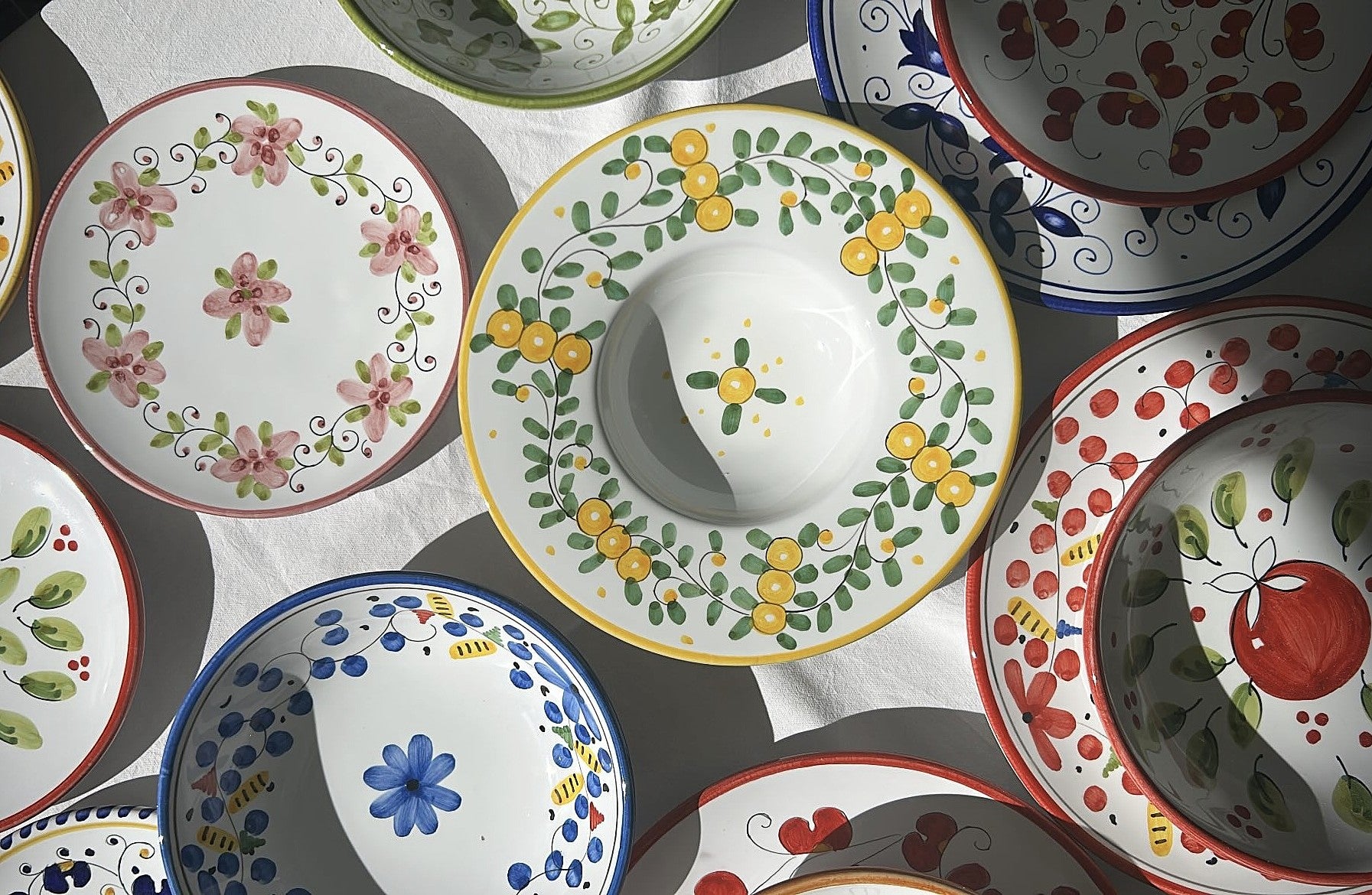 Des motifs exclusifs, imaginés par nos soins en France, et de la vaisselle en céramique fabriquée et peinte à la main en Italie pour des tables ensoleillées ☀️